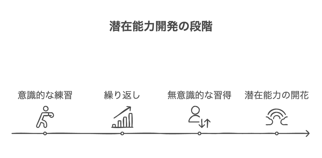 しかし、私たちが 「潜在能力を引き出す」 ことは可能です。例えば、スポーツ選手が新しい技を習得するとき、最初は意識してフォームを確認しながら動きますが、繰り返し練習することで、その動作は無意識にできるようになります。この 「意識 → 無意識」 への移行こそが、成長のプロセスなのです。