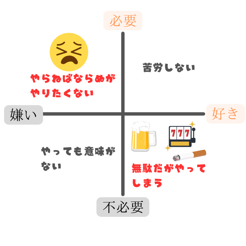 森岡毅さんが「必要だけど嫌なこと」と「不要だけど好きなこと」この2つをどうコントロールするかが重要だと言っておられました。