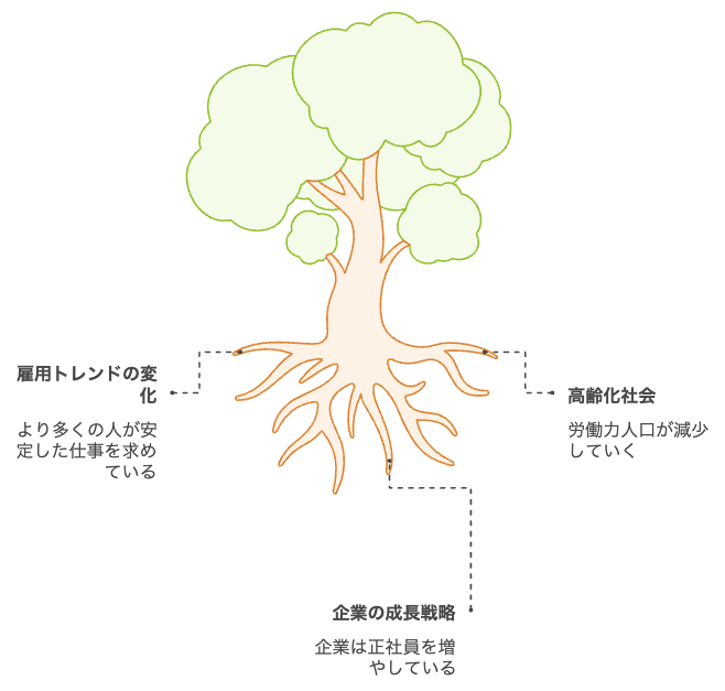 これは、企業が長く安定して成長していくために正社員雇用を増やしていることや、安定した仕事を求める人が増えてきたことが関係しています。